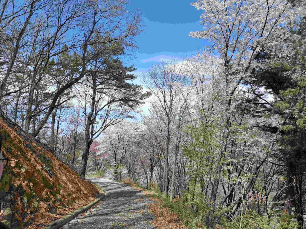 돌아오는 길은 도로를 따라 이동하면 돼요. 이 길에 벚꽃이 정말 예쁘게 피어서 사진 찍기에도 좋아요. 인생샷을 건질 수 있는 포인트가 곳곳에 있어서 좋았습니다.